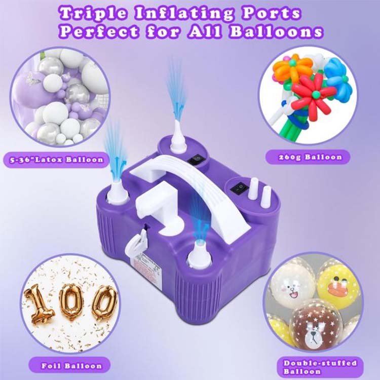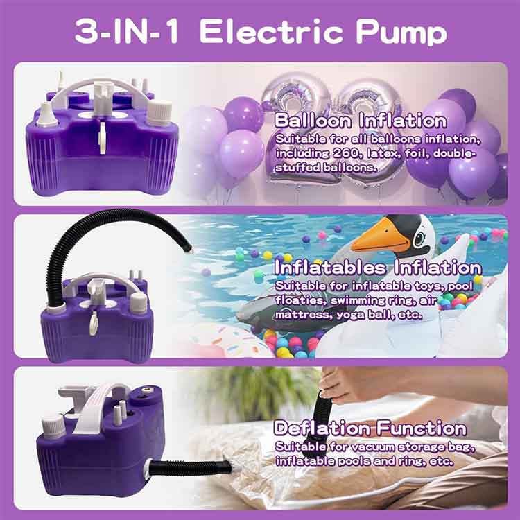 Newshine®'s nyligt opgraderede 3 i 1 Electric Balloon Pump har et tredobbelt professionelt ballondysesystem: 2 runde latex ballondyser nøjagtigt passer til 5-36 tommer standard latex balloner, hvilket gør dem lette at bruge til alt fra farverige ballonvægge på fødselsdagsfester til romantiske ballonkæder i Weddings; 1 Udvidet professionel ballondyse blæser op med aluminium og metalliske filmballoner, poppende balloner, dobbeltlag oppustelige balloner og 260q/360q magiske balloner, hvilket giver mulighed for kreative vendinger og former som Animal Balloons, Floral Decorations og andre DIY-skabelser. En pumpe håndterer alle ballontyper.