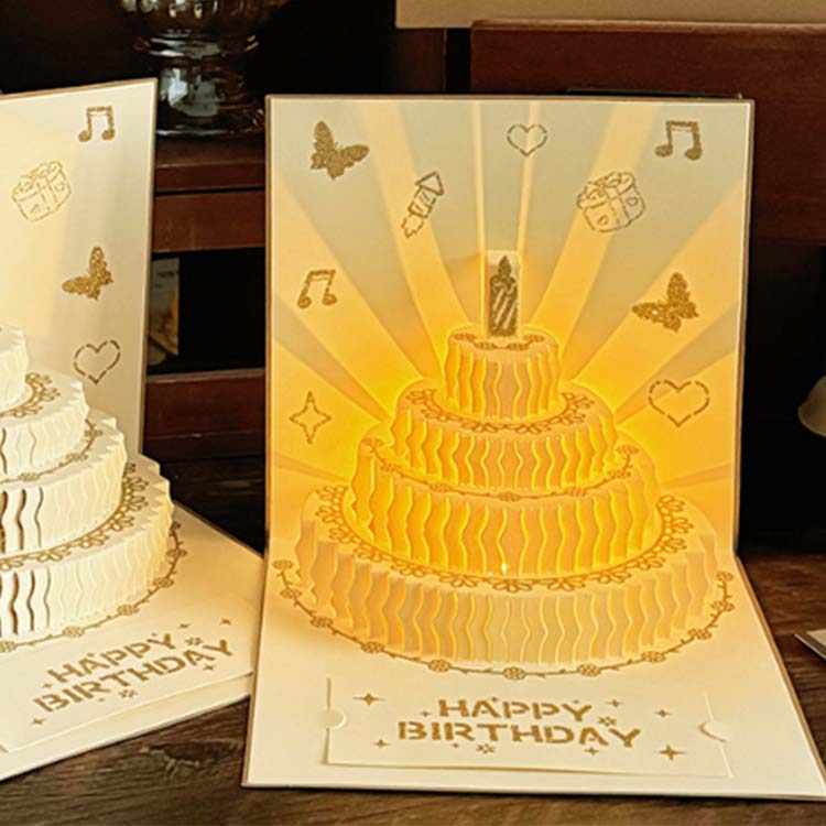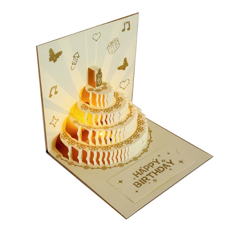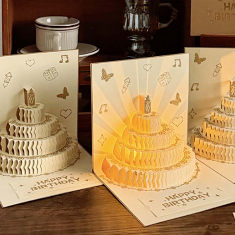 3D -fødselsdagskortet er et nyt produkt i kategorien lykønskningskort. Lavet af miljøvenlige og sikre materialer har det en tredimensionel form og intern belysning og musikeffekter. Kompakt og bærbar består det af en konvolut, et kort og et lille kort. Det er et omfattende fødselsdagskort, der blander klassiske og moderne elementer.