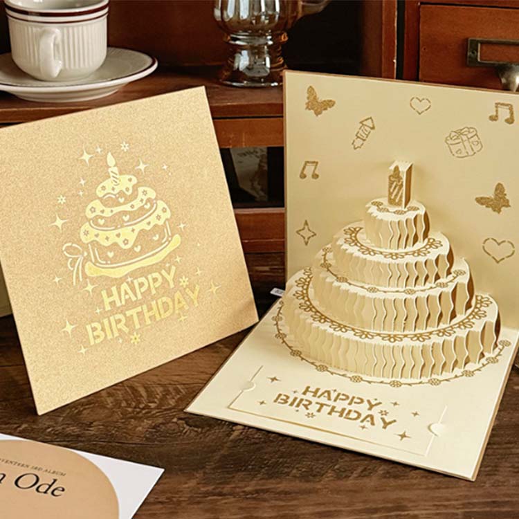 Omslaget til 3D -fødselsdagskortet er lavet med en farvet prægningsproces. Dets interiør har et design af en 4-lags kage, og et lille lykønskningskort tilføjes til lykønskningsmeddelelsen.