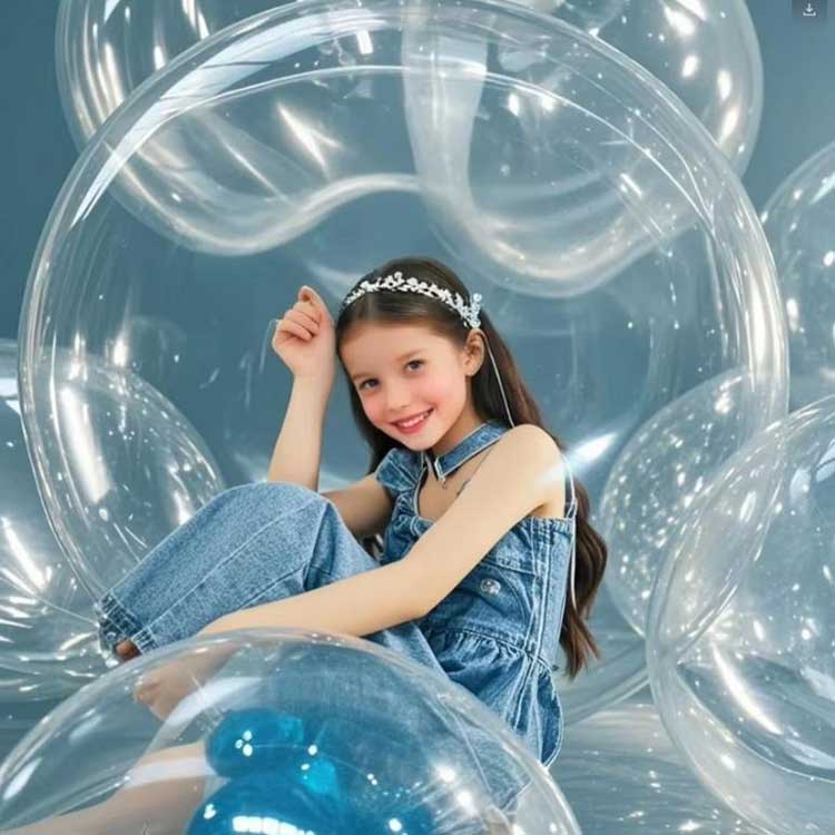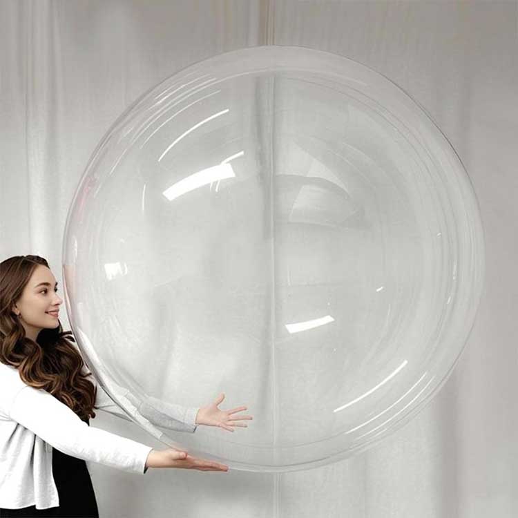 48 tommer runde klare Bobo-balloner kan tilpasse sig forskellige miljøer. Når de er parret med 10 LED-lysstrenge og fyldt med helium, kan de skabe en lyseffekt. Disse balloner kan bruges til kommercielle udstillinger for at opnå præcis markedsføring; de kan også bruges til at fylde børnefester med farverige skum- eller fjerblade. et nyligt bryllup blev 100 specialfremstillede 48-tommer runde gennemsigtige bobleballoner brugt og vandt stor ros.