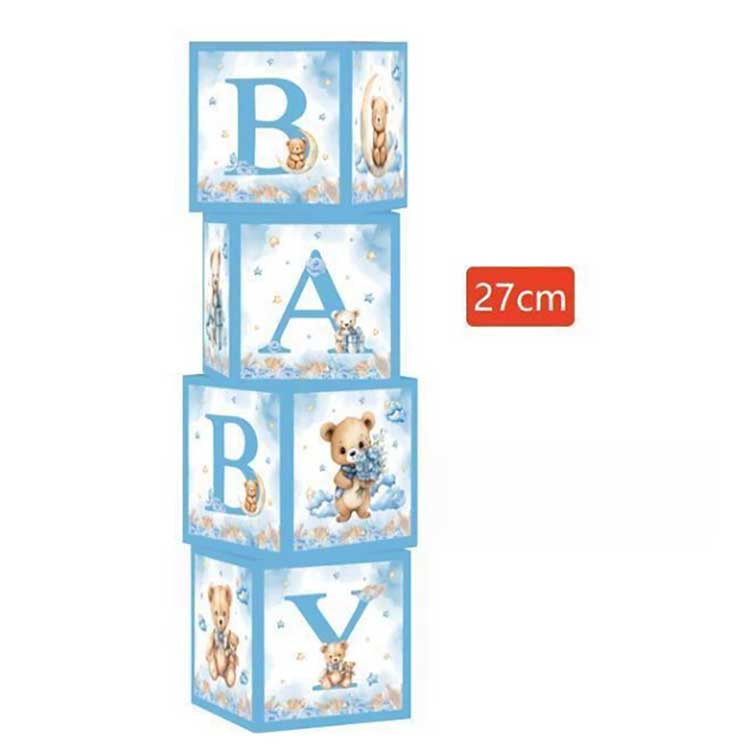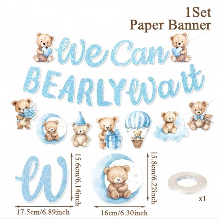 Fødselsdagsbanner: 1 banner/sæt, med 2-3 hængereb til ophængning af dekoration; trykt med "Tillykke med fødselsdagen" eller "Velkommen". Tekst med babytema