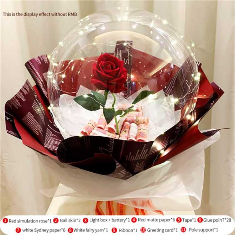 Størrelse:High-end versionen ca. 50 cm lang med en 35 cm lang pind; mellemklasse- og standardversionen bruger en 70 cm lang pind med en samlet størrelse på ca. 80 cm. Den avancerede version indeholder meretilbehør:3 lag silkepapir 3 lag blomstret indpakningspapir 1 lag gaze. mellemklasseversionen inkluderer: 1 lag silkepapir 1 lag indpakningspapir 1 lag gaze. Standardversionenomfatter:1 lags gaze hjerteformede BOBO balloner.