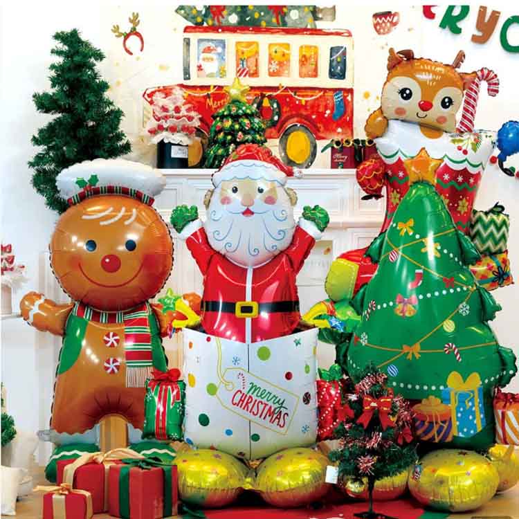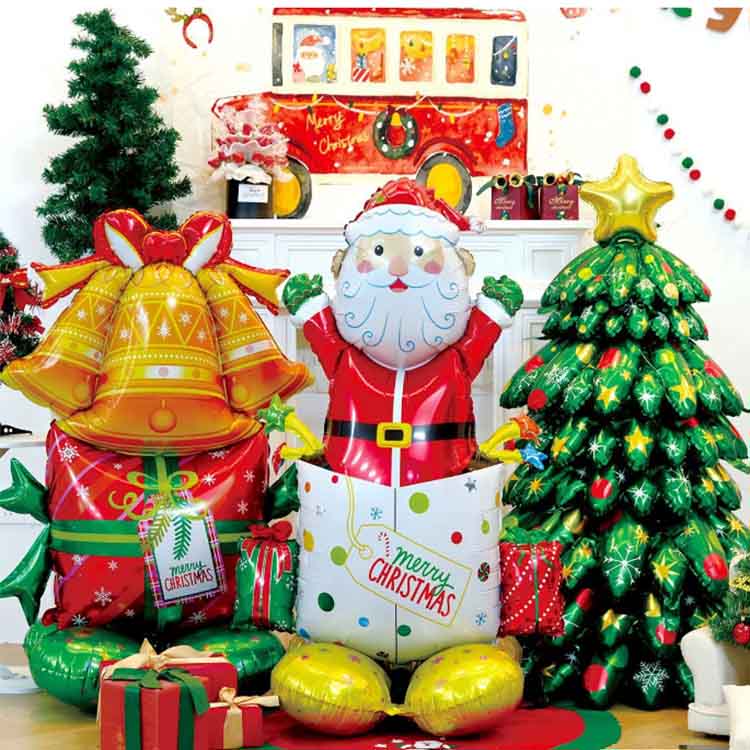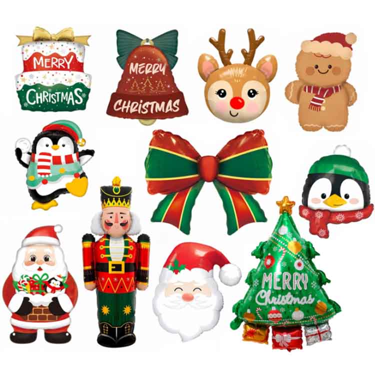 Juleballoner af aluminiumsfolie inkorporerer juleelementer i deres design. Tilgængelig i klassiske former som julemanden, juletræer, snefnug og klokker, er disse balloner prydet med "Glædelig jul"-slogans. Farverne inkorporerer juleelementer, primært med jule-tema farver som rød, grøn, guld og sølv, hvilket skaber en festlig atmosfære. Tilgængelig i en lang række størrelser, fra en mini 30 cm til en kæmpe 100 cm, de imødekommer en række dekorative scenarier og behov.