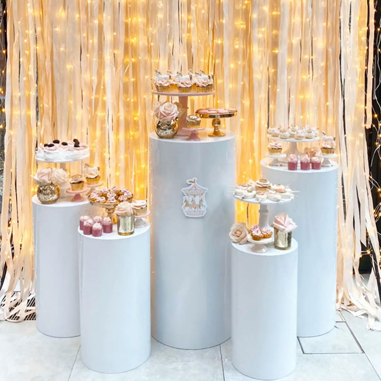 Det cylindriske base dessertbord fungerer både som beholder og pynt. Normalt kommer de i forskellige kombinationer: 3-delt kombinationer, 5-delt kombinationer, 7-delt kombinationer og så videre. Den mest almindelige kombination er fem stykker. Uafhængige cylindriske rør i forskellige størrelser kan arrangeres fleksibelt, og de er en vigtig del af scenen. Samtidig tilbyder vi også tilpasning til størrelse og form. Desuden matcher de dine festdekorationer.