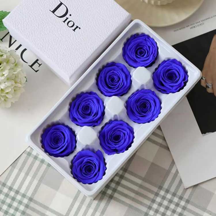Roser er klassificeret i tre niveauer: A, B og C. Grade A roser er større og fyldigere. Vores Everlasting Flower 8 blomster Rose Gaveæske er lavet med Grade A roser. Gaveæskens dimensioner er 24cm*13cm*8cm. Hver kasse vejer cirka 150g. Holdbarhed af konserverede blomster: 3-5 år under normale opbevaringsforhold, hvilket er mere gavnligt for dit salg.