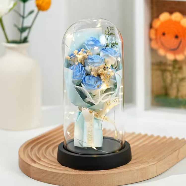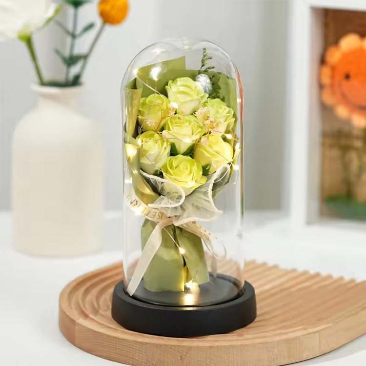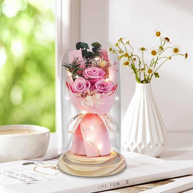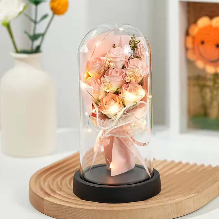 Glaskuppel sæberosebuketten med LED bruges i kombination med sæbeblomster og konserverede blomster.LED-lys bruger varmt og ikke-blændende lys, som kan tilføje en varm atmosfære, når du dekorerer scener. Den indbyggede LED-lyssnor har også farverige blinkende lys, og farverne kan tilpasses til dine behov.Denne buket med glasomslag kan bruges til f.eks. osv., og kan også gives som gave.Evigende blomster vil ikke visne og vil ikke ændre farve selv med et glasbetræk. Sæbeblomster kan også bruges til at vaske hænder eller som duft. Denne rosenbuket er økonomisk og praktisk.