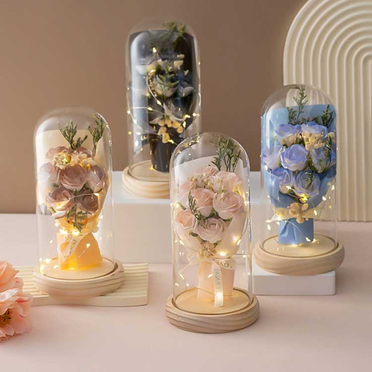 Glasblomsten lavet af højkvalitetsglas og miljøvenligt massivt træ, sammen med højkvalitets glas- og plastikbunde, er disse blomster håndlavede af håndværkere, hvor hver blomst er arrangeret inde i en glaskuppel. Når sollys skinner gennem glasset og bryder farverne på blomsterne, er dette den unikke romantiske og overraskende kvalitet ved det.