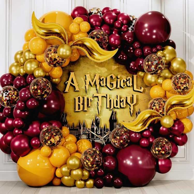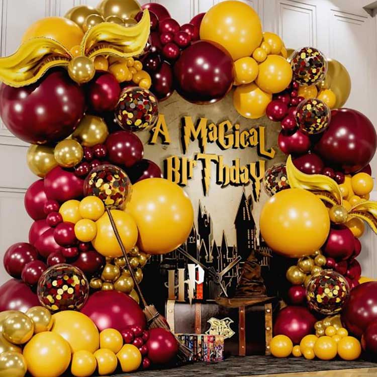 Designet af Harry Potter ballon guirlande kit er en stor og smuk ballon guirlande; i dette sæt er alle latexballonerne lavet af højkvalitets, ren naturlatex, med en vis tykkelse og elasticitet og af fremragende kvalitet; dets typiske træk er lyse farver og gengivelse af høj kvalitet, hvilket gør det til et typisk kendetegn, der gør det muligt for alle, der elsker magiske troldmænd, at føle, som om de er lige der. Ud over de runde standardballoner inkluderer sættet dekorative gyldne hornformede folieballoner. Når de er oppustet, kan de placeres hvor som helst efter dine præferencer.