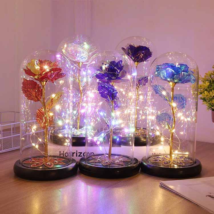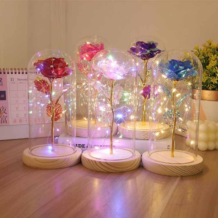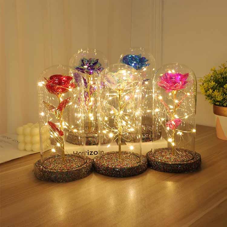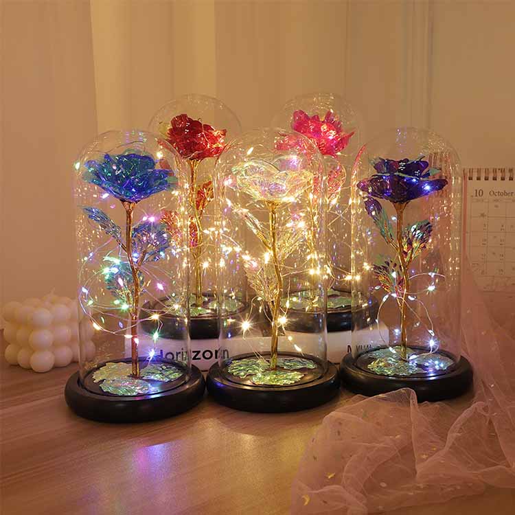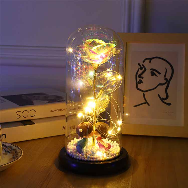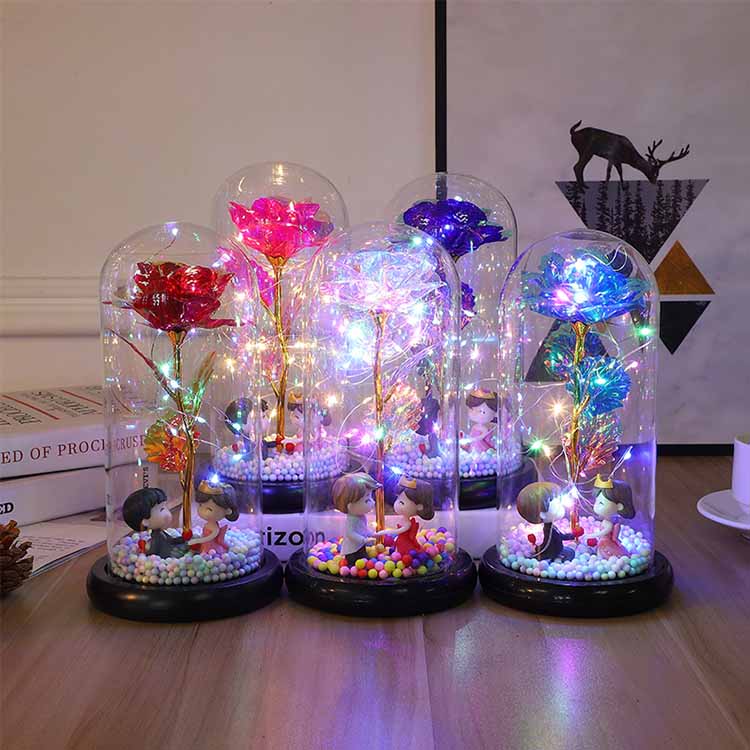 LED 24K glasrosen inde i det beskyttende kabinet, Vi har mange dukker og legetøj. Kunder kan vælge deres yndlingsdukker og farven på de blomster, de kan lide. Vi kan tilpasse dem efter dine krav.