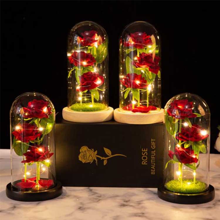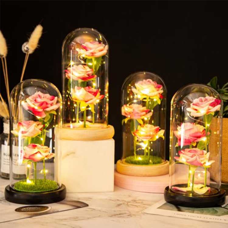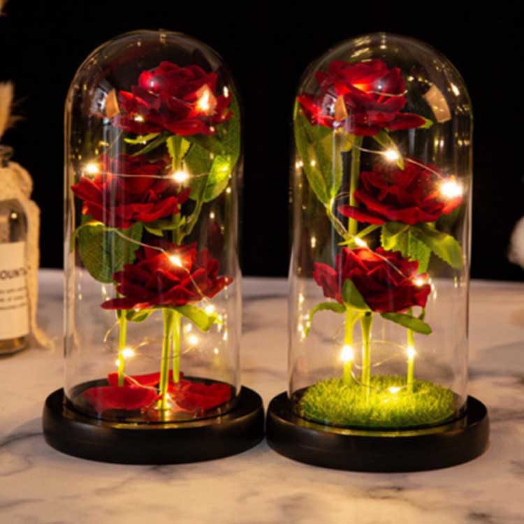Inde i rosenglaskuplen er der tre bevarede blomster placeret i forskellige højder, med realistiske stilke og grønne blade. Glasdækslet er varmebestandigt og beskadiges ikke let. LED-slyngelysene har indbygget blød belysning, og kontakten er placeret under træfoden for nem betjening. Velegnet til brug i bryllupsdekorationer og boliginventar, og kan også medfølge som gavesæt til fødselsdagsgave. kuppel og et tilpasseligt gavekort.