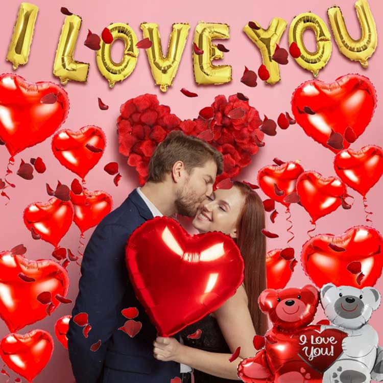 Valentinsdag folieballoner har søde slogans som "I Love You" og "Happy Valentine's Day". Ballonerne kommer i levende rød, pink og guldfolie, hvilket skaber en tredimensionel effekt, når de pustes op. Visuelt præsenterer de en romantisk festlig atmosfære. Udover slogans kommer de også i forskellige former, såsom roser, bjørne, der krammer hjerter og læber, blandt mange andre. Du kan vælge baseret på den specifikke indstilling og stil.